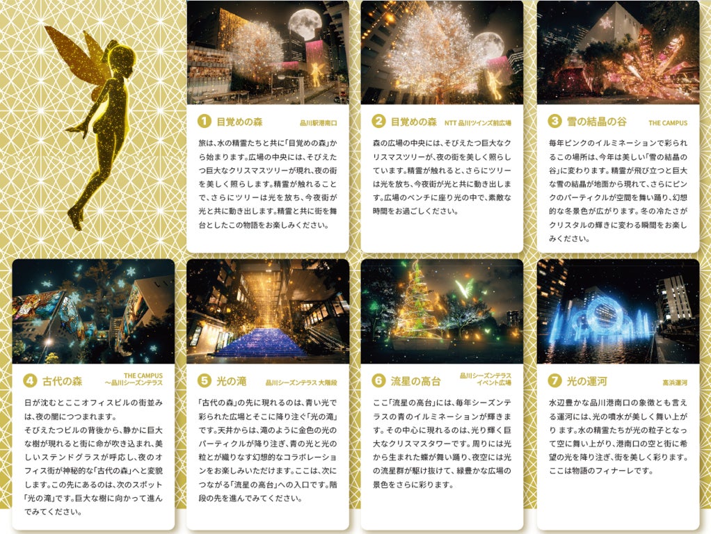 本コンテンツでは、精霊が道案内人となり、イルミネーションが輝く品川港南エリアの夜を導きます。普段見慣れたオフィスビルや広場、水辺が、美しい光に包まれ、いつもとは違った街並みをお楽しみいただけます。