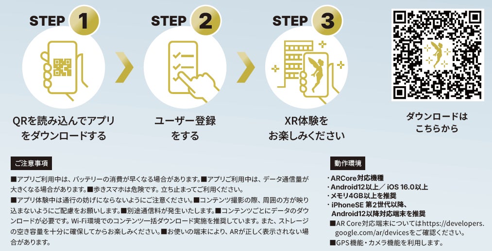参加方法: 本イベントサイト(下記)より、専用アプリをお手持ちのスマートフォンなどにダウンロードすることにより、各スポットにてXRコンテンツをご覧いただけます。
