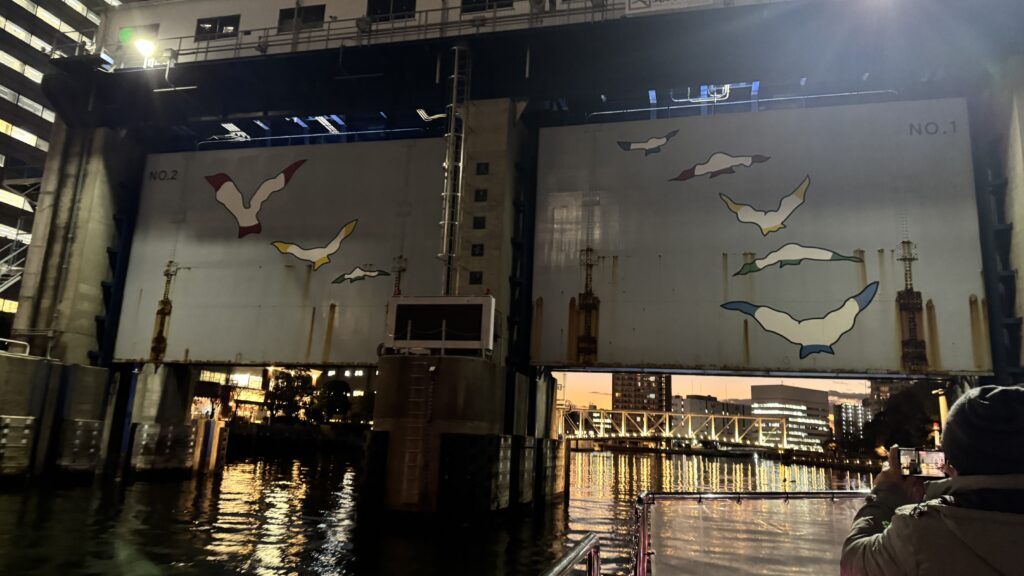 キラキラとした水面の景色に目を奪われているうちに、船はあっという間に目黒川付近へ。目黒川水門をくぐり抜け、いよいよ目黒川へと突入します。桁下2mほどの低い橋をいくつもくぐり抜けて進む時間は、まさに非日常。頭上スレスレを通過するのは迫力満点でした。