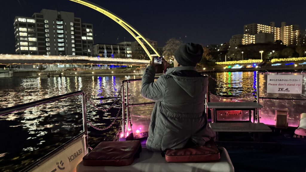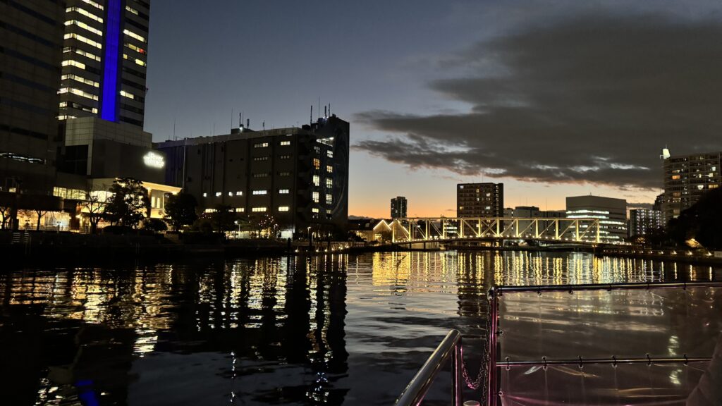 今の時期は少し肌寒いですが、澄んだ冬の空気は、夜景をいっそうクリアに見せてくれます。いつもの景色が、船から見るとまるで別世界!日常のはずなのに、どこか旅の途中にいるようでした。
