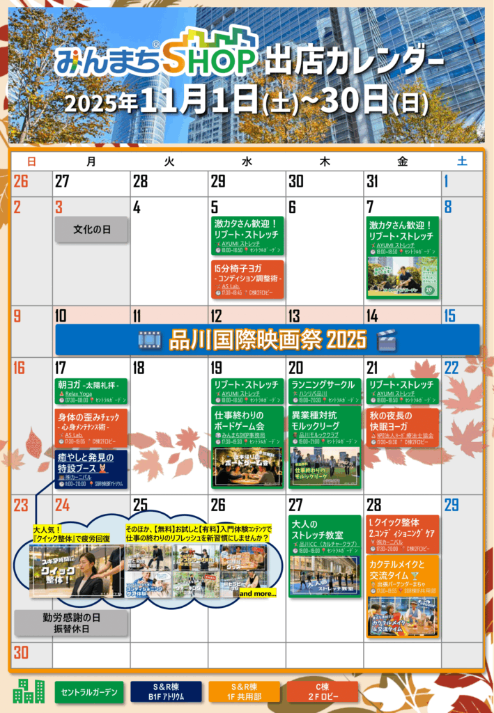 「品川インターシティにて「品川国際映画祭」が開催されることに伴い、以下の期間は「みんまちSHOP」のプログラム実施をお休みさせていただきます。