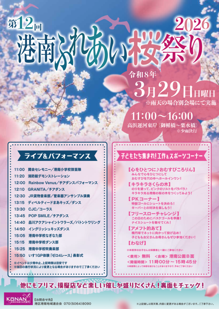 港南エリアの春の恒例イベント「第12回 港南ふれあい桜祭り」が、2026年3月29日(日)に開催されます。会場は高浜運河沿い(御楯橋〜楽水橋付近)。満開の桜の下で、地域の皆さんが集い、春の訪れを楽しむ一日です。